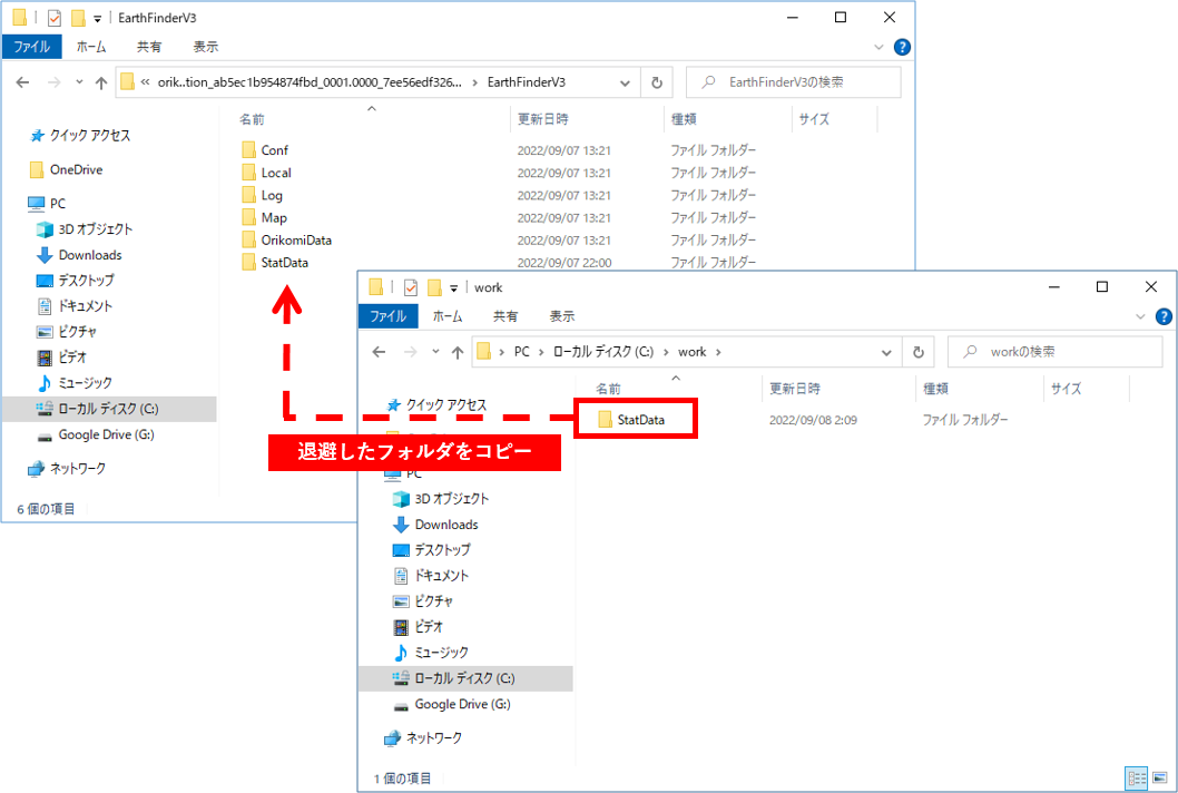 既に「EarthFinderV3」フォルダに「StatData」フォルダがある場合は、そのフォルダをリネームするか削除してから、コピーしてください。