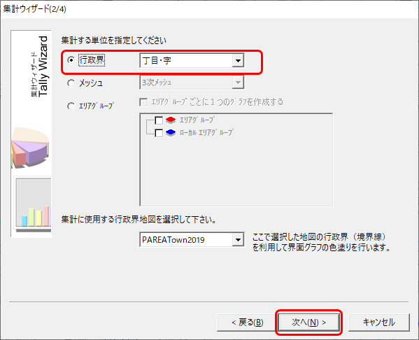 3. 「集計ウィザード(2/4)」画面で、行政界より「丁目・字」を選択し、次へボタンをクリックします。