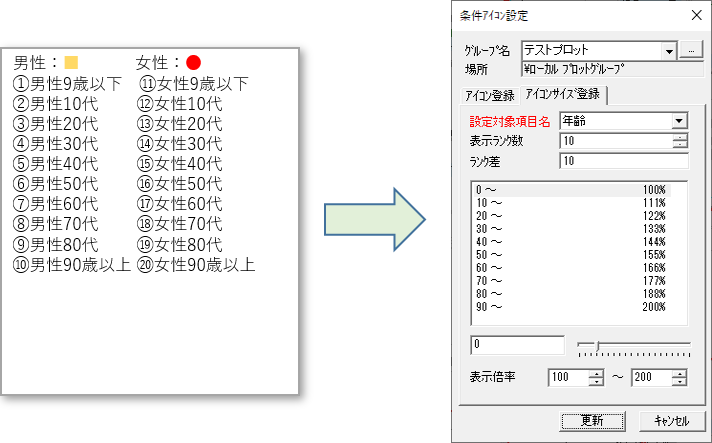 プロットの条件アイコン設定に、2条件(例えば、性別と年齢)でのアイコン設定をする方法
